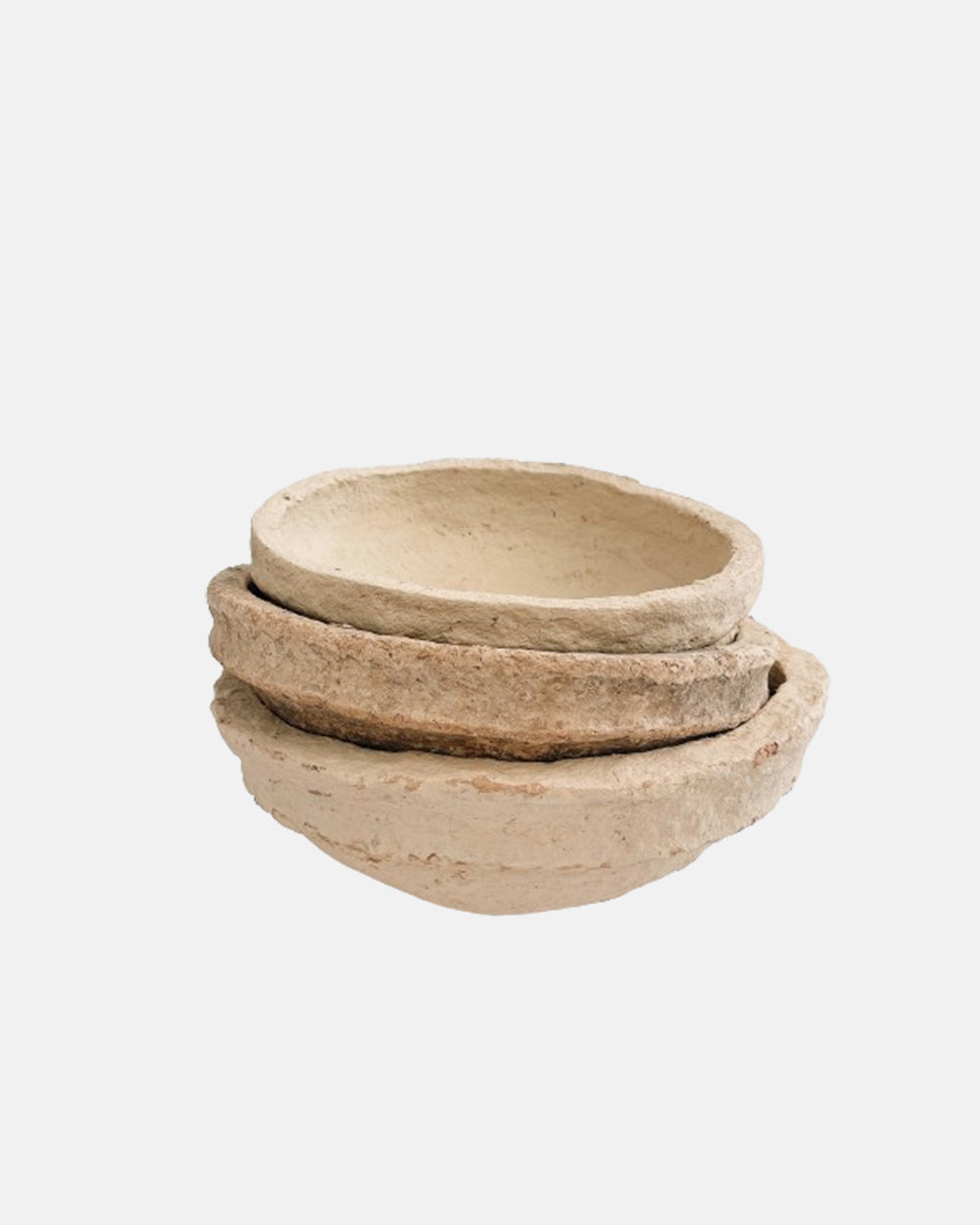 Wabi sabi. Inspired in design by vintage artifacts, these accent paper-mâché bowls are handmade from recycled paper clay. Each bowl is different in shape, size, and texture, and is perfectly imperfect. These bowls make stunning accents for any table, sideboard, shelf, or coffee table.