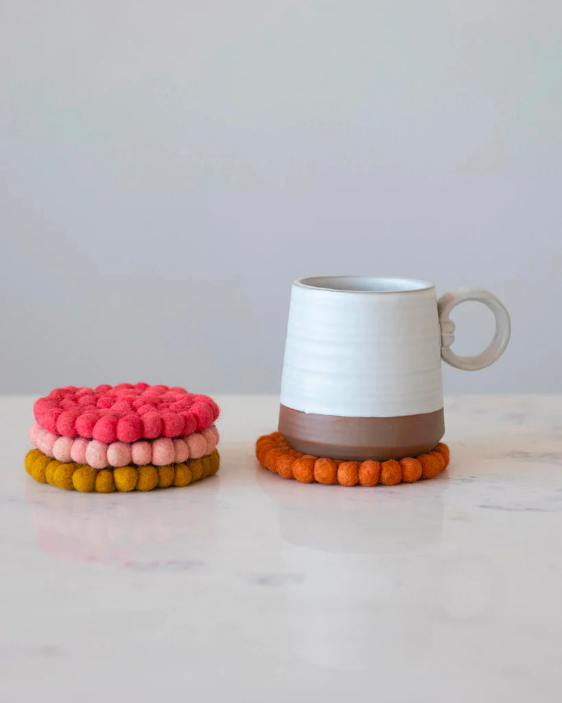 Woven beauty. Bring bohemian texture to your home with this handwoven wool coaster set. With textured felt balls, this coaster gives any tabletop a colorful touch.