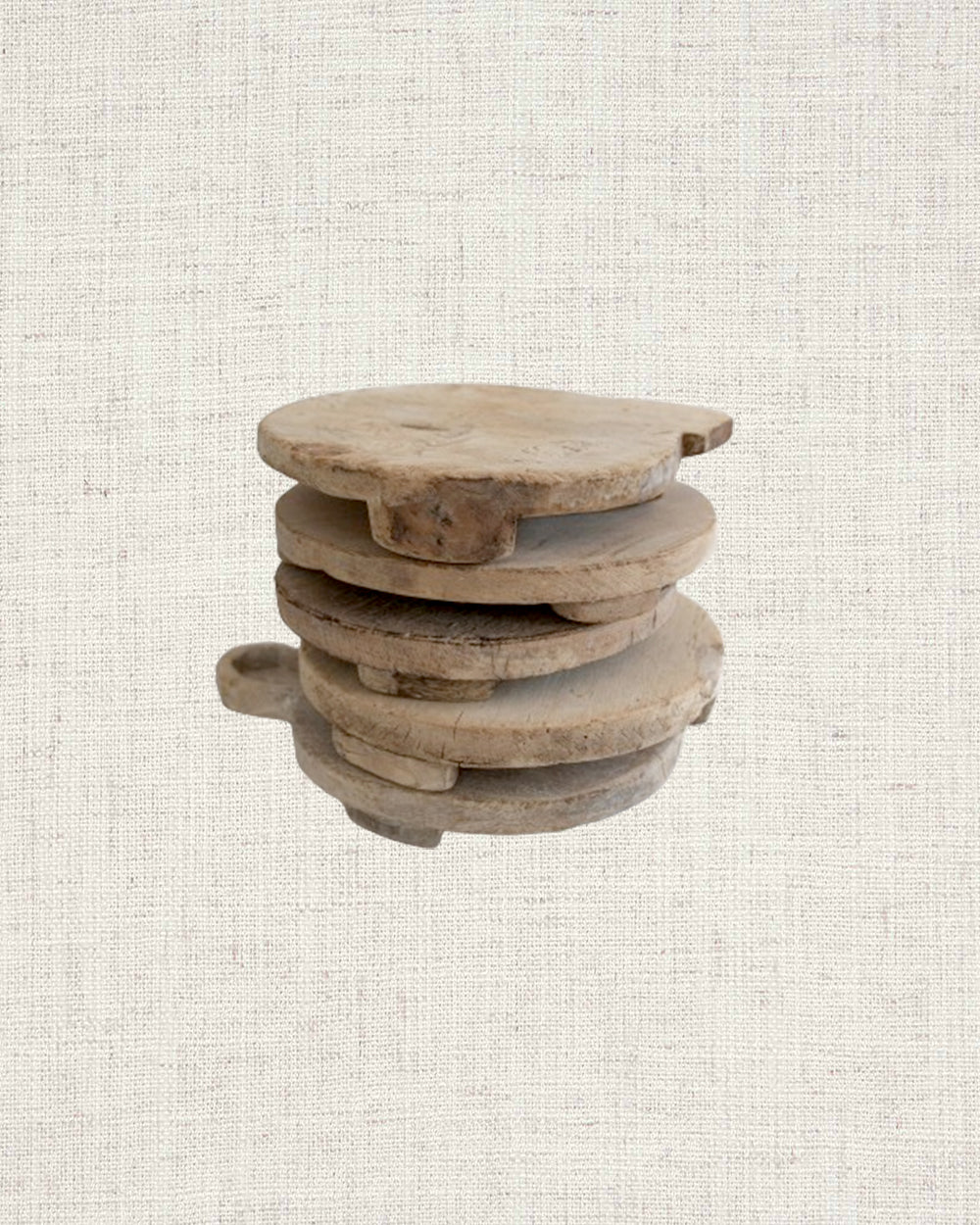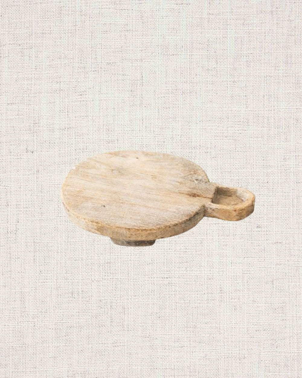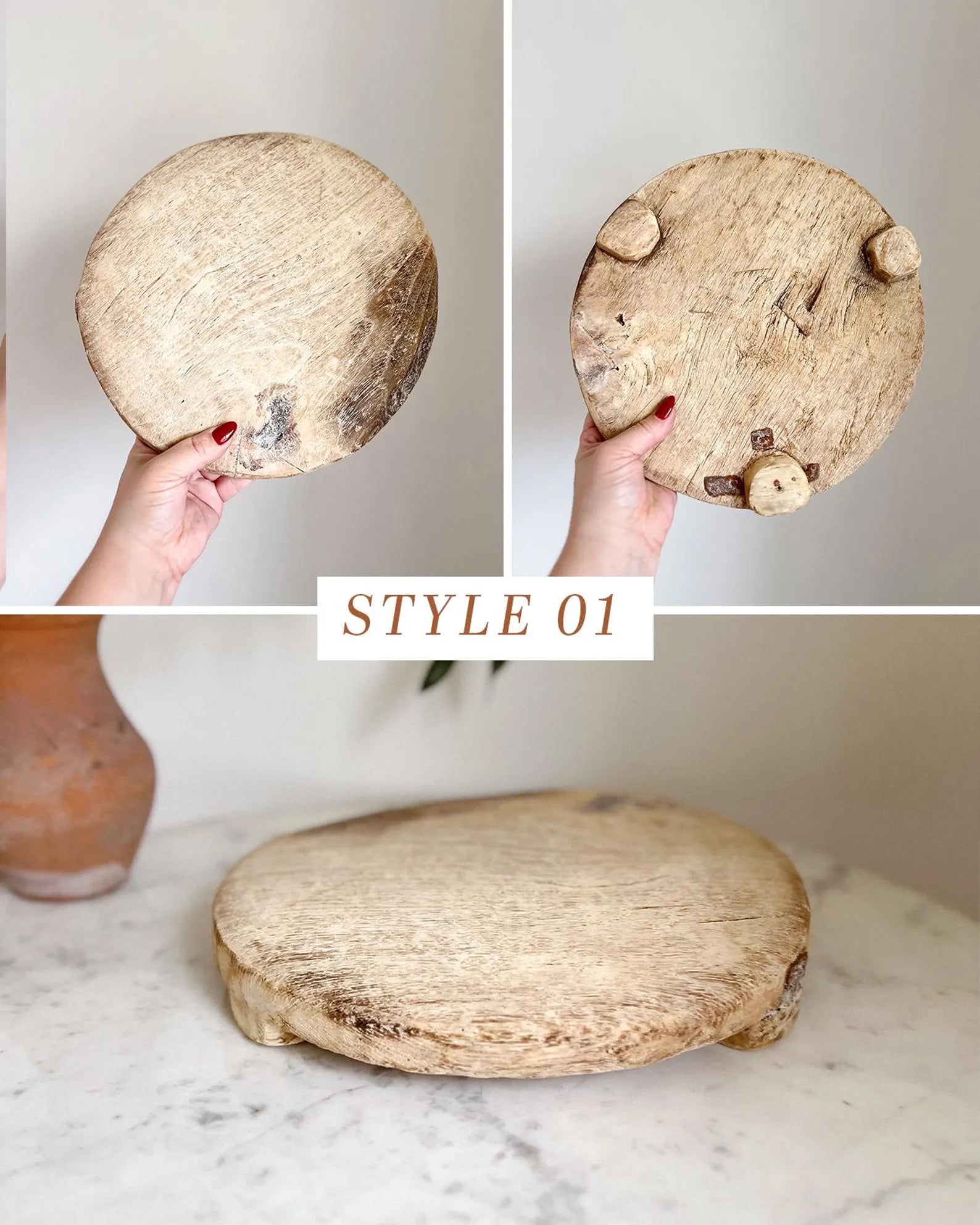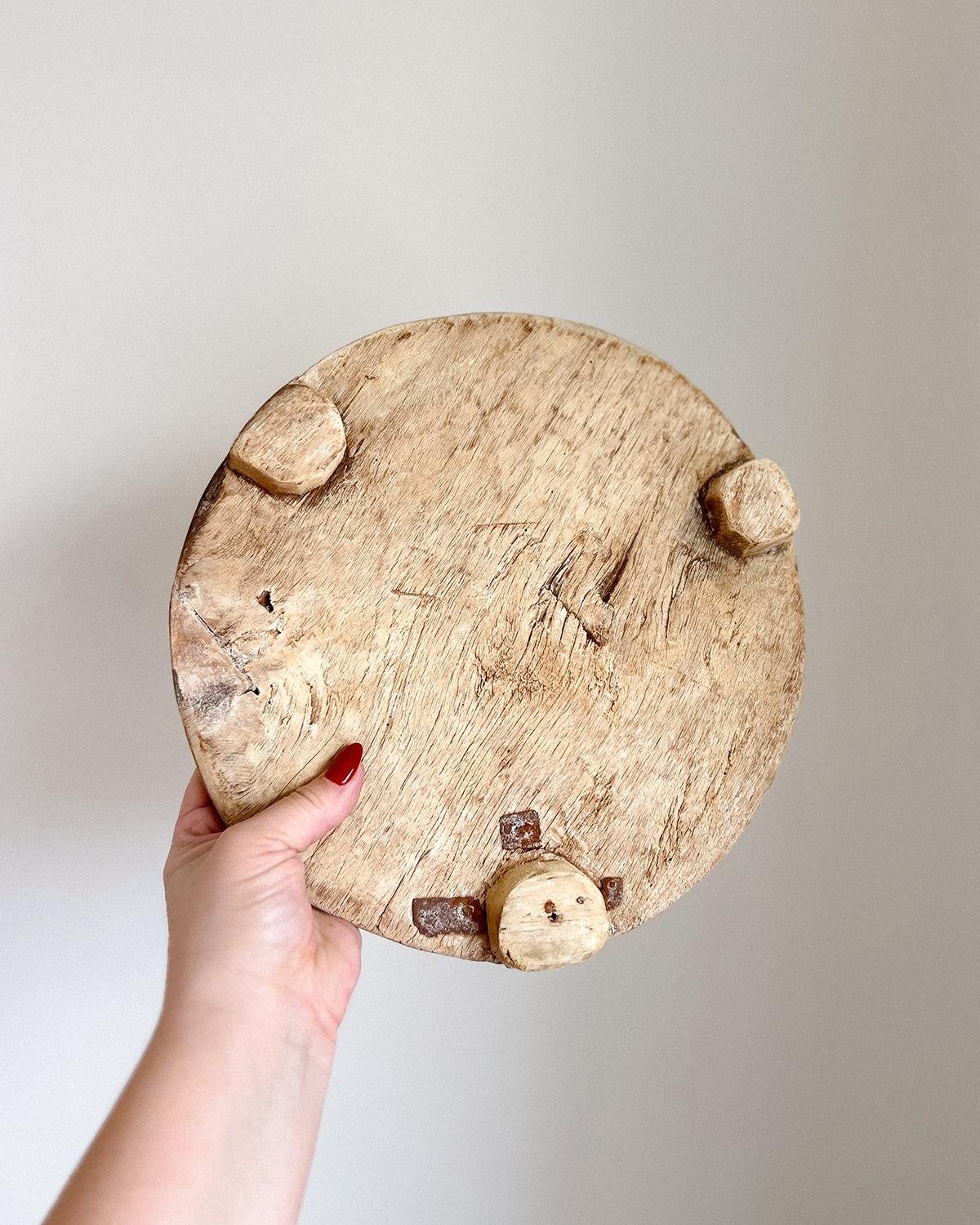 Wabi sabi. Originally used for rolling unleavened chapati dough, this object adds warmth to your chosen space as a pedestal for decor or as a rustic serving alternative. Crafted from reclaimed wood, these former dough pedestals have their own unique story to tell. Each antique item is truly one-of-a-kind and weathered uniquely over time. A stunning unique object as a display piece. Originally used for rolling unleavened chapati dough, this object adds warmth to your chosen space as a pedestal for decor or as a rustic serving alternative.