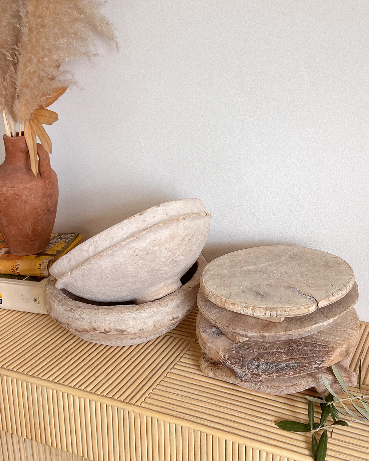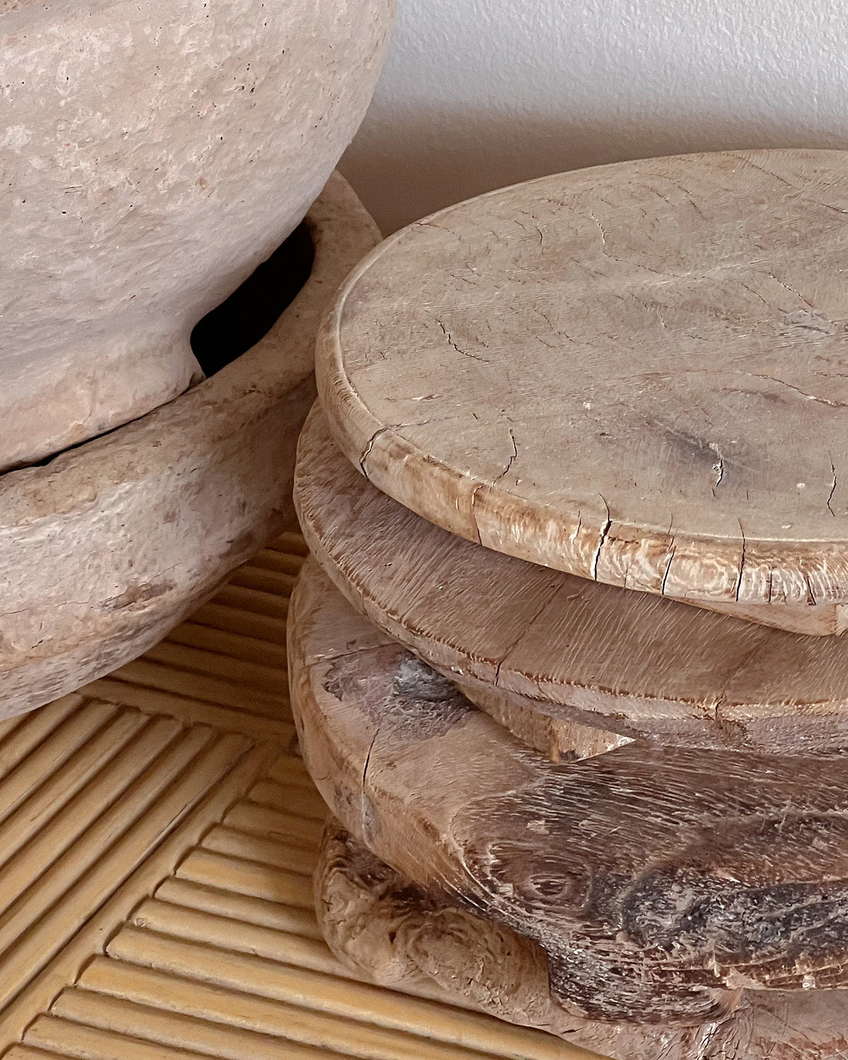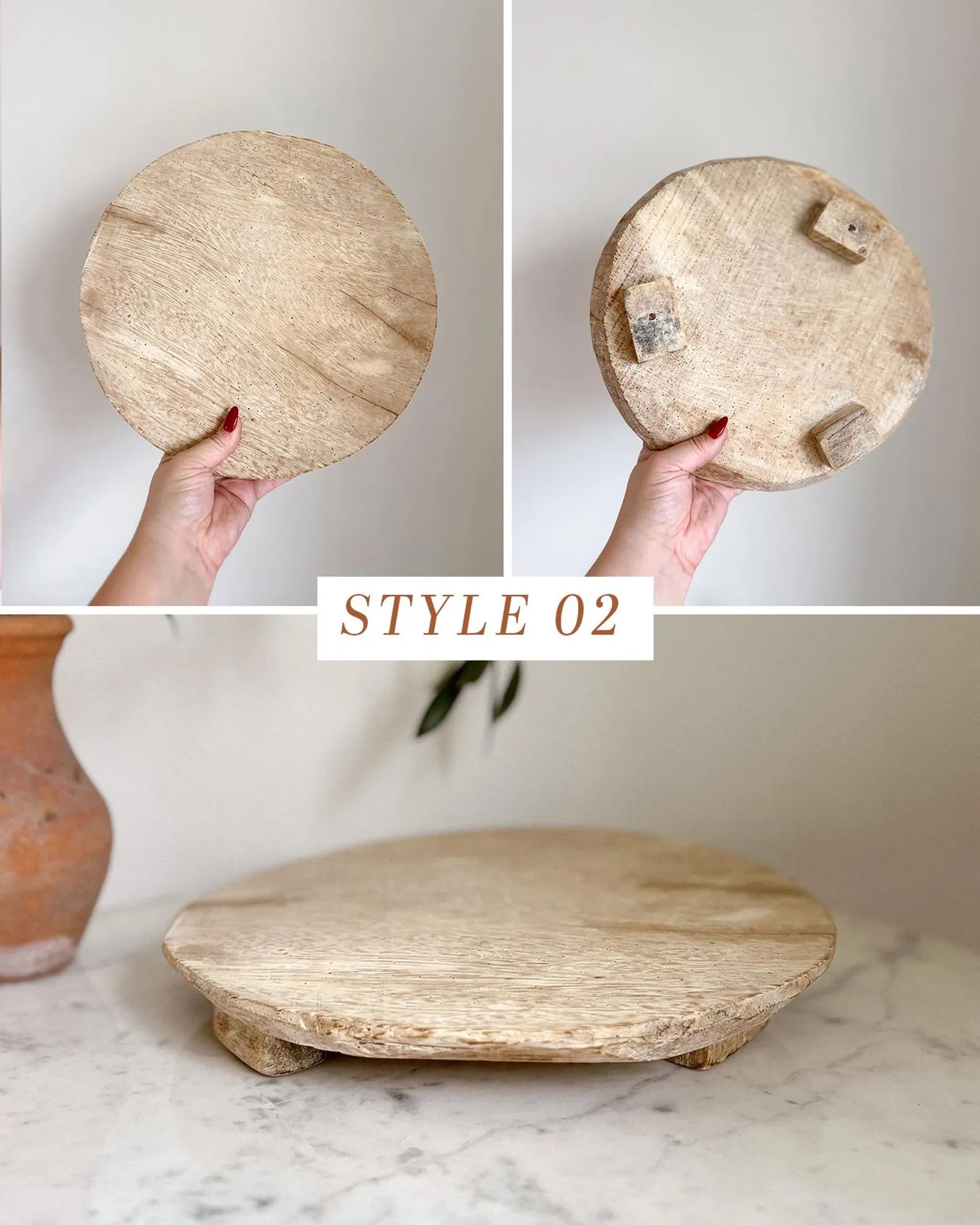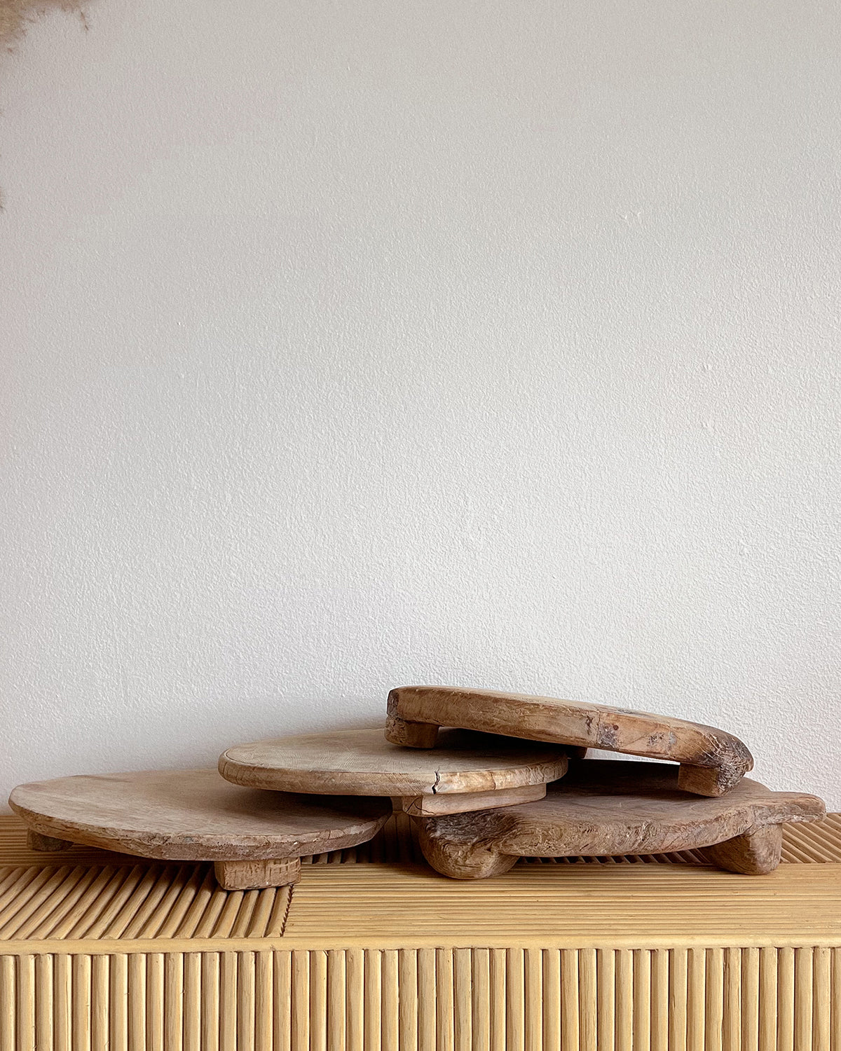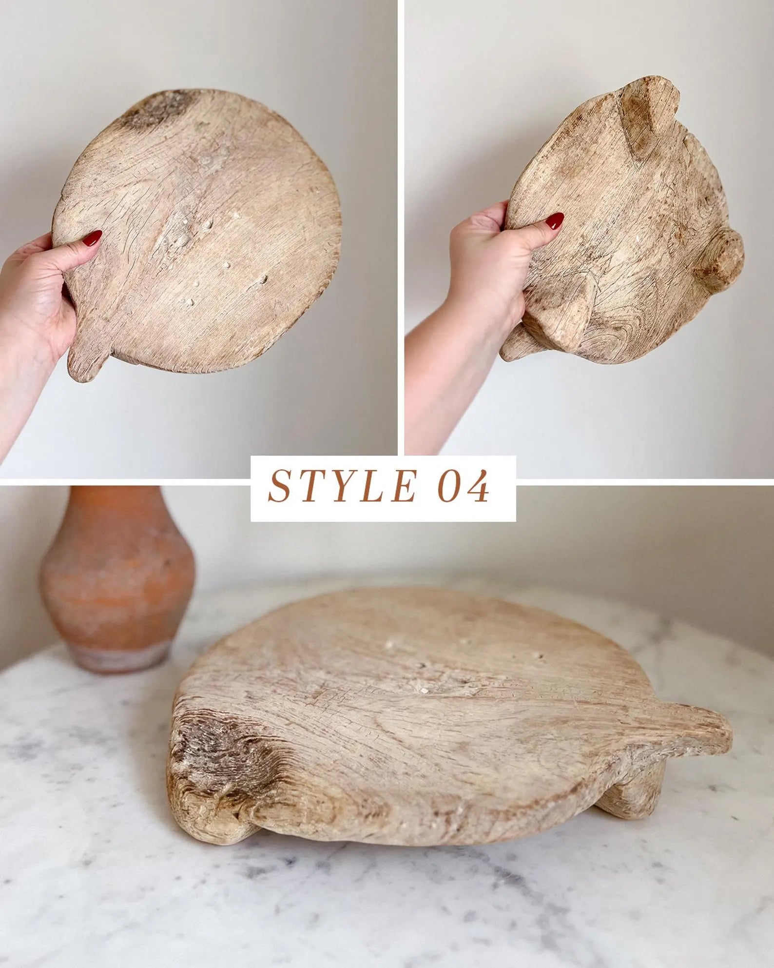Wabi sabi. Originally used for rolling unleavened chapati dough, this object adds warmth to your chosen space as a pedestal for decor or as a rustic serving alternative. Crafted from reclaimed wood, these former dough pedestals have their own unique story to tell. Each antique item is truly one-of-a-kind and weathered uniquely over time. A stunning unique object as a display piece. Originally used for rolling unleavened chapati dough, this object adds warmth to your chosen space as a pedestal for decor or as a rustic serving alternative.