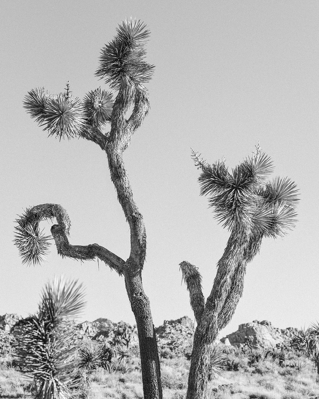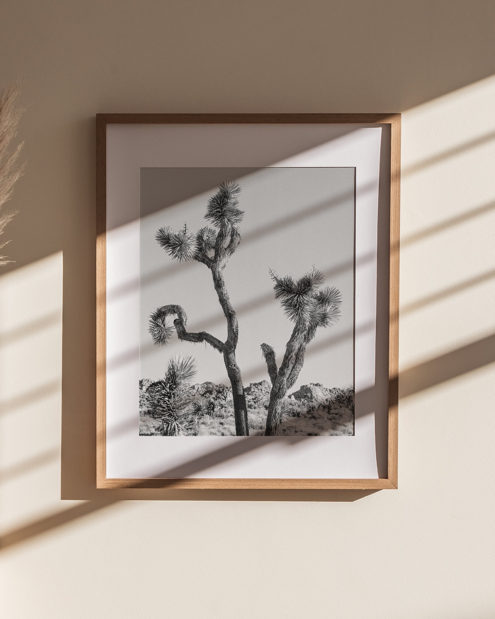 A neutral, grainy desert scene in Joshua Tree, California. The Yucca Brevifolia is the giant, tree-like plant found growing across the rugged terrain of California's mojave desert. A beautiful, minimal art print to brighten your walls. Photography by Erika Carlock.