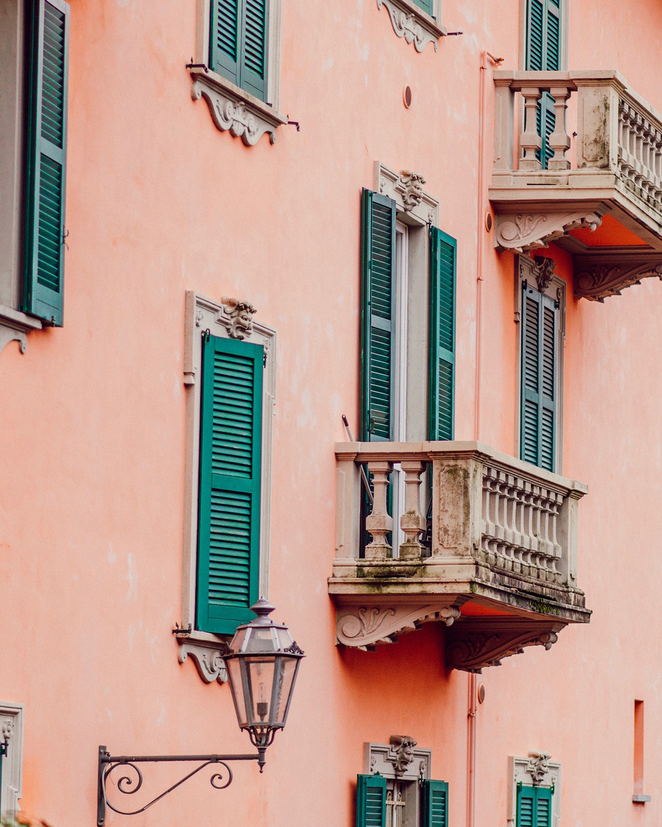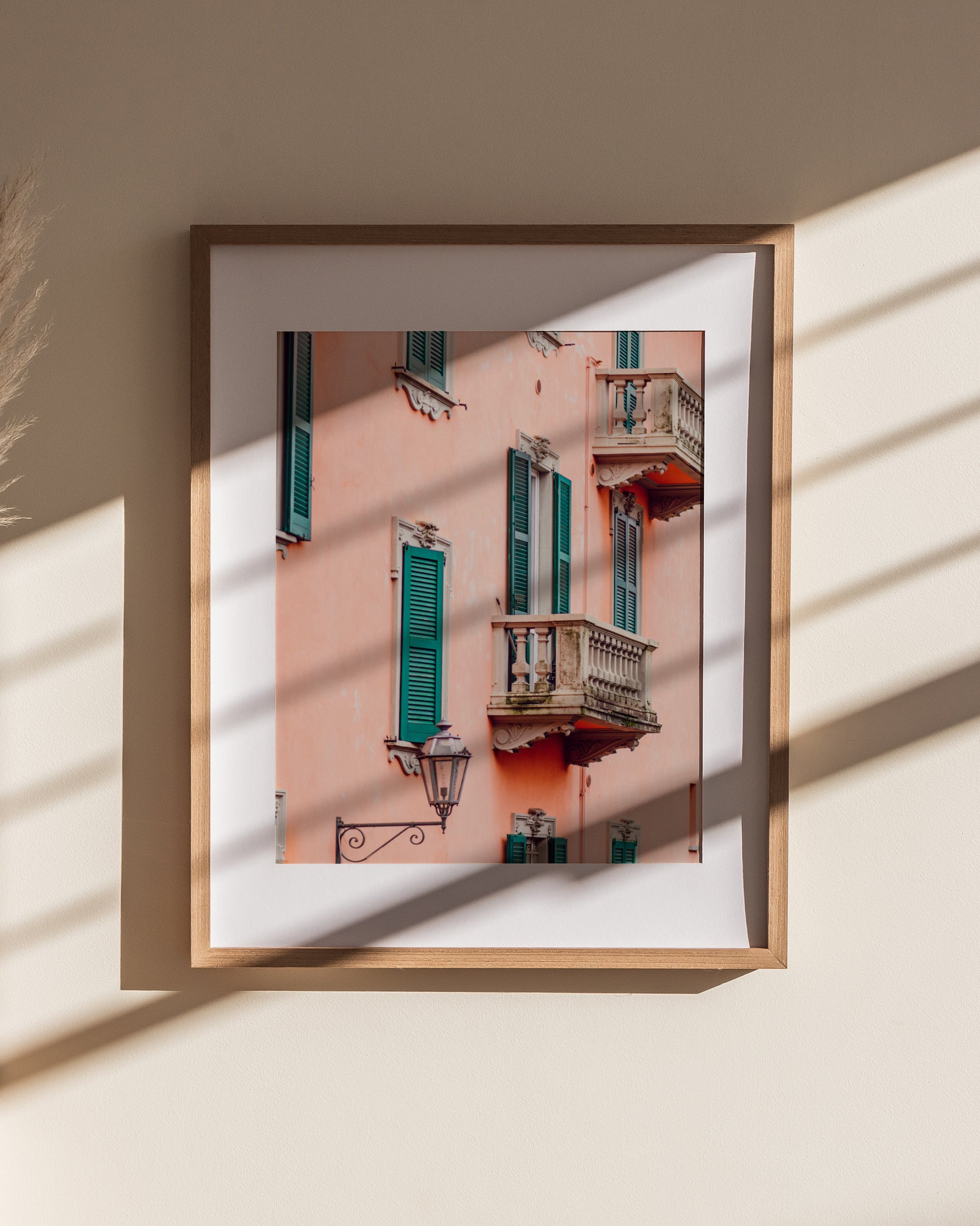 A pastel pink building in France with flowers in the window by Erika Carlock. A beautiful, minimal art print to brighten your walls.
