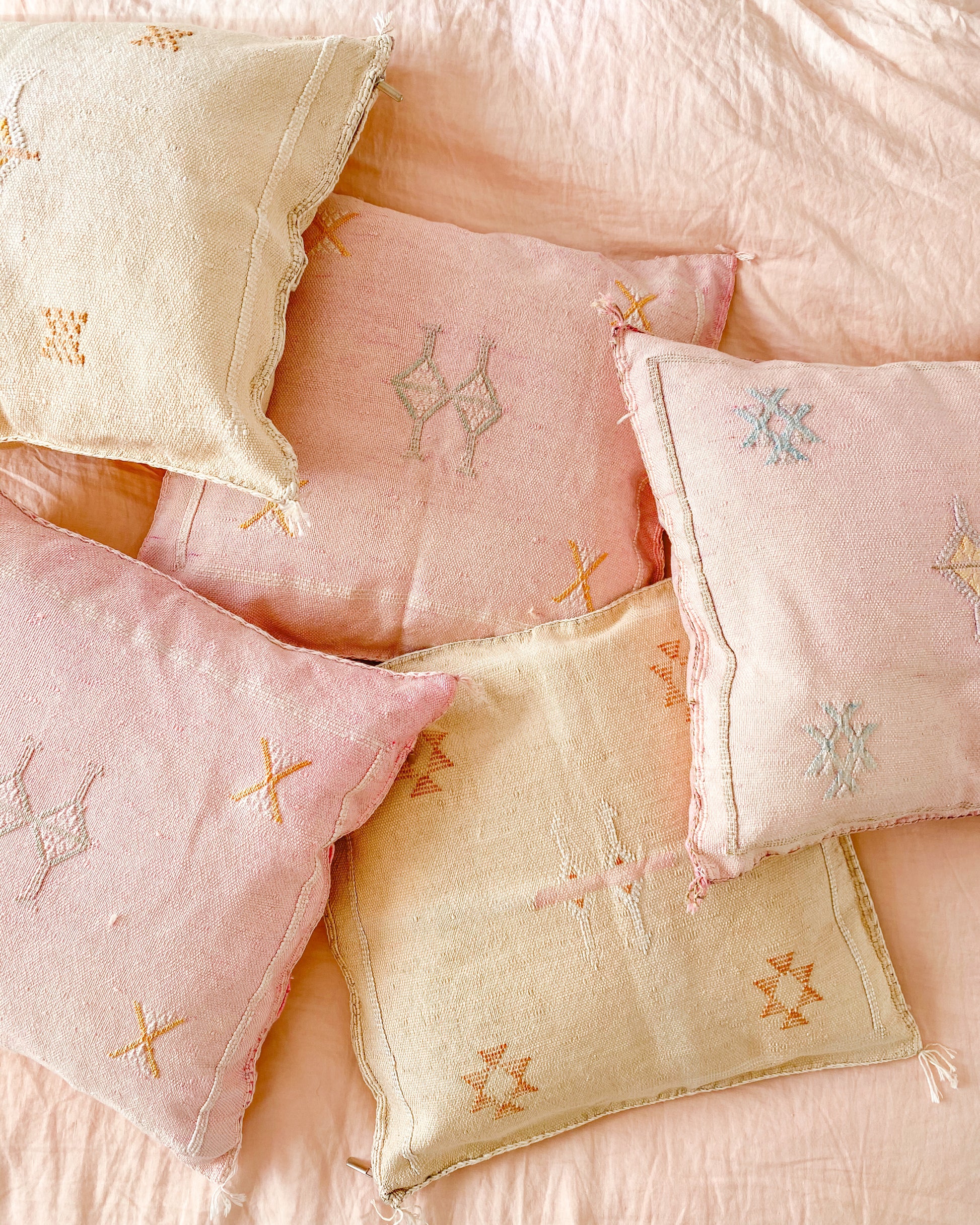 Moroccan Sabra: A Moroccan tradition—cactus silk, or sabra is a handmade fabric crafted of agave silk using a process of peeling the agave succulent to produce threads. The threads are then colored with vegetal dyes, and woven on traditional weaving looms making each pillow unique and special.