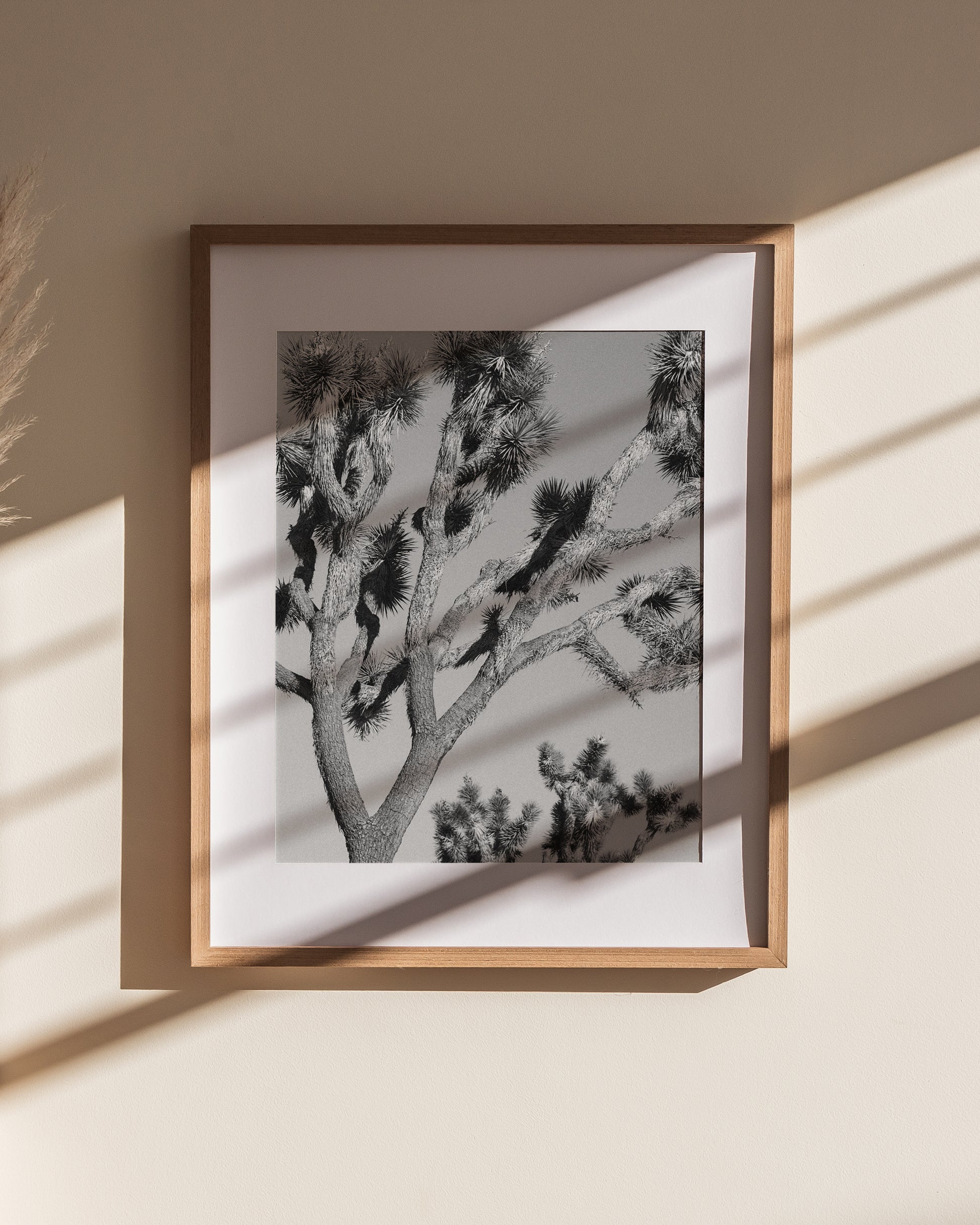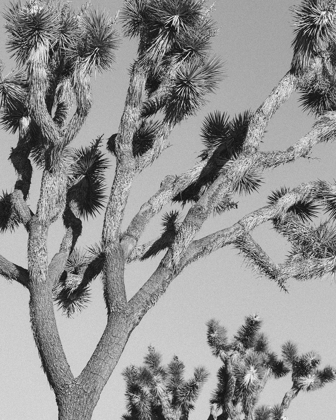 A neutral, grainy desert scene in Joshua Tree, California. The Yucca Brevifolia is the giant, tree-like plant found growing across the rugged terrain of California's mojave desert. A beautiful, minimal art print to brighten your walls. Photography by Erika Carlock.