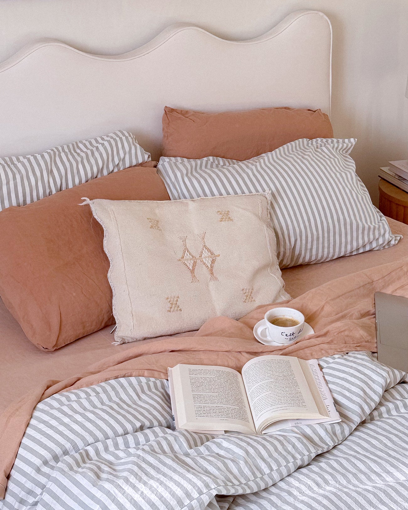 Moroccan Sabra: A Moroccan tradition—cactus silk, or sabra is a handmade fabric crafted of agave silk using a process of peeling the agave succulent to produce threads. The threads are then colored with vegetal dyes, and woven on traditional weaving looms making each pillow unique and special.