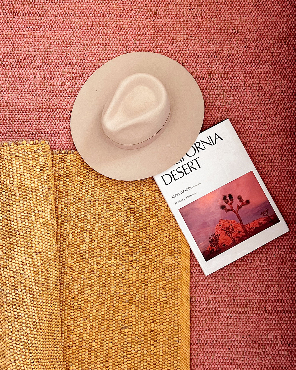 Weavers use natural jute and cotton fibers to create monochrome rugs inspired by the dry, sunbaked desert landscapes. The use of bright tones is a reference to the bright tones of flowers, insects and various natural hues in nature.