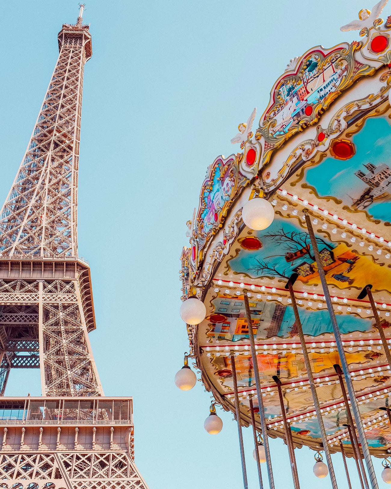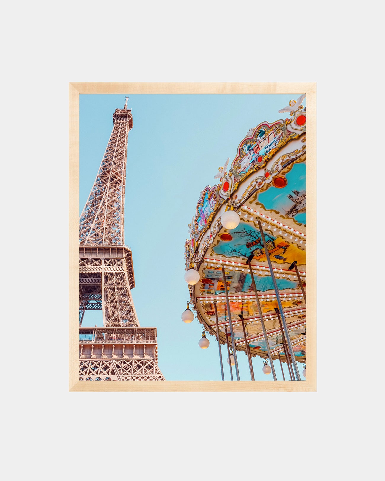 A vibrate view of the Eiffel Tower and carousel in Paris by Erika Carlock. A beautiful, minimal art print to brighten your walls.