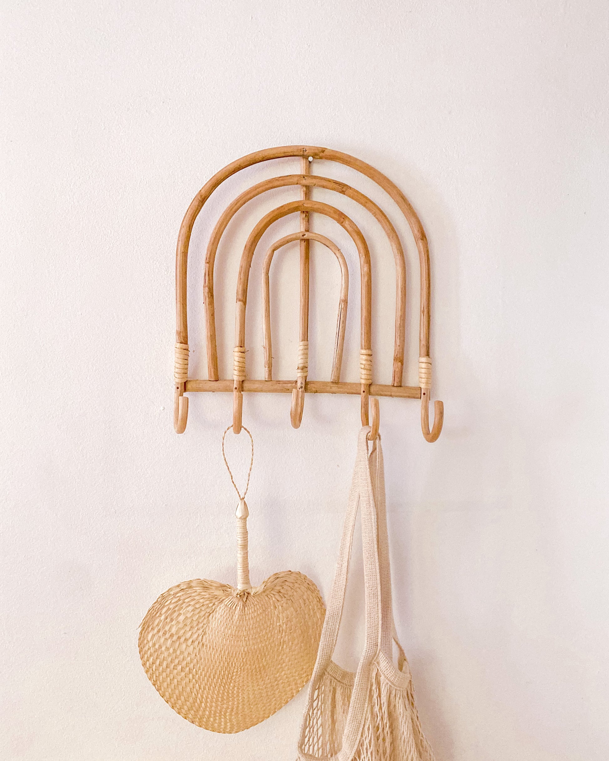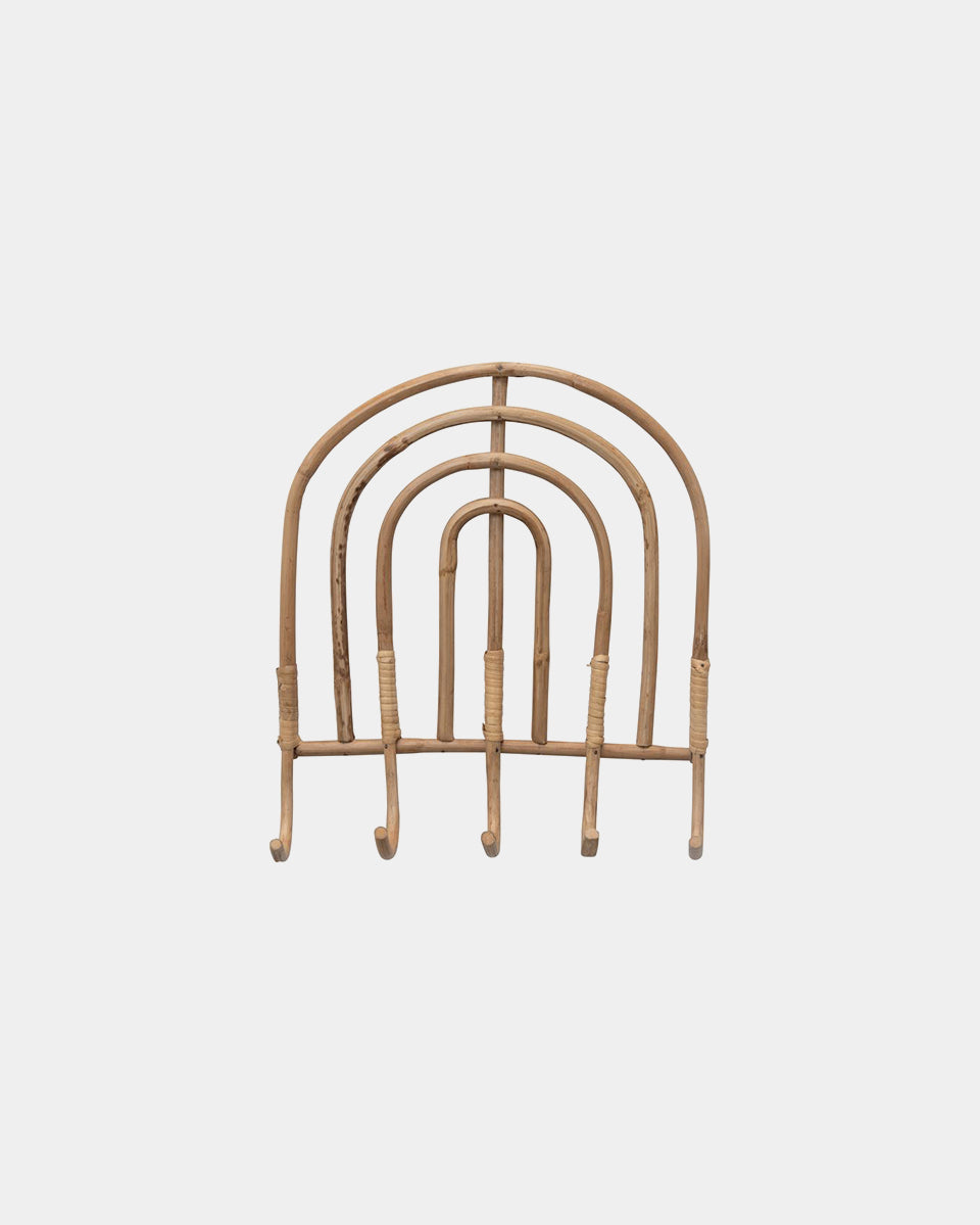 Bohemian-inspired wall storage made from natural rattan fibers shaped like a rainbow. Crafted of natural rattan, this handmade wall hook brings boho style and a touch of whimsy to any space.
