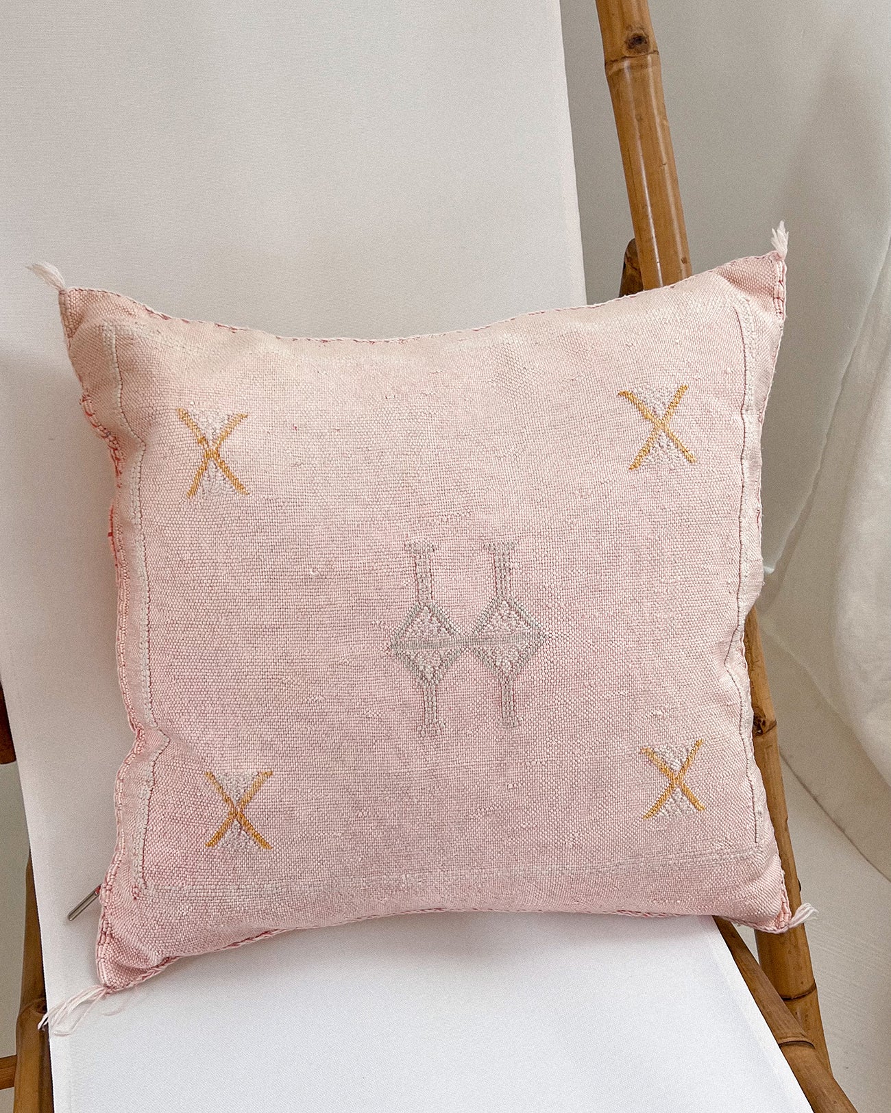 Moroccan Sabra: A Moroccan tradition—cactus silk, or sabra is a handmade fabric crafted of agave silk using a process of peeling the agave succulent to produce threads. The threads are then colored with vegetal dyes, and woven on traditional weaving looms making each pillow unique and special.
