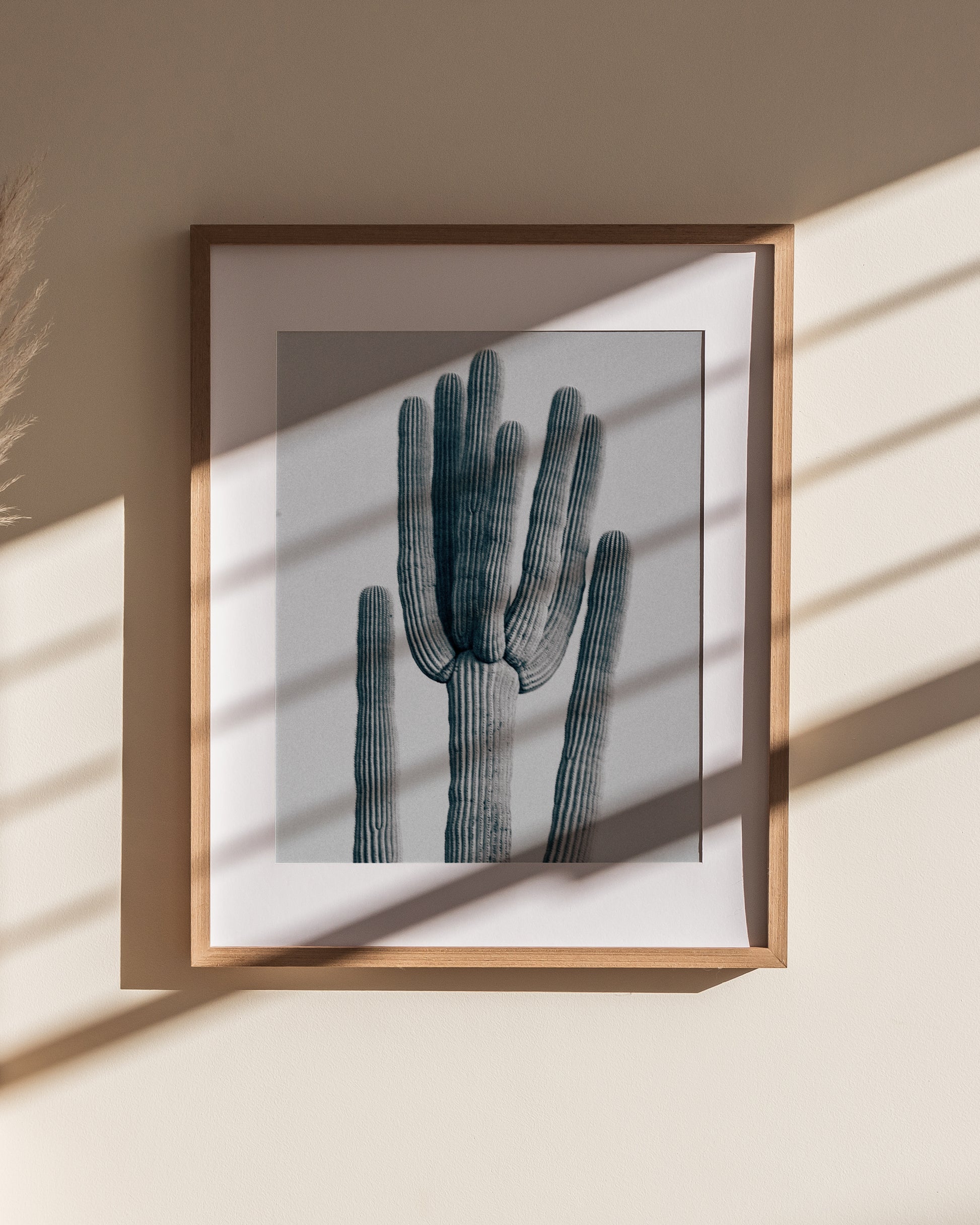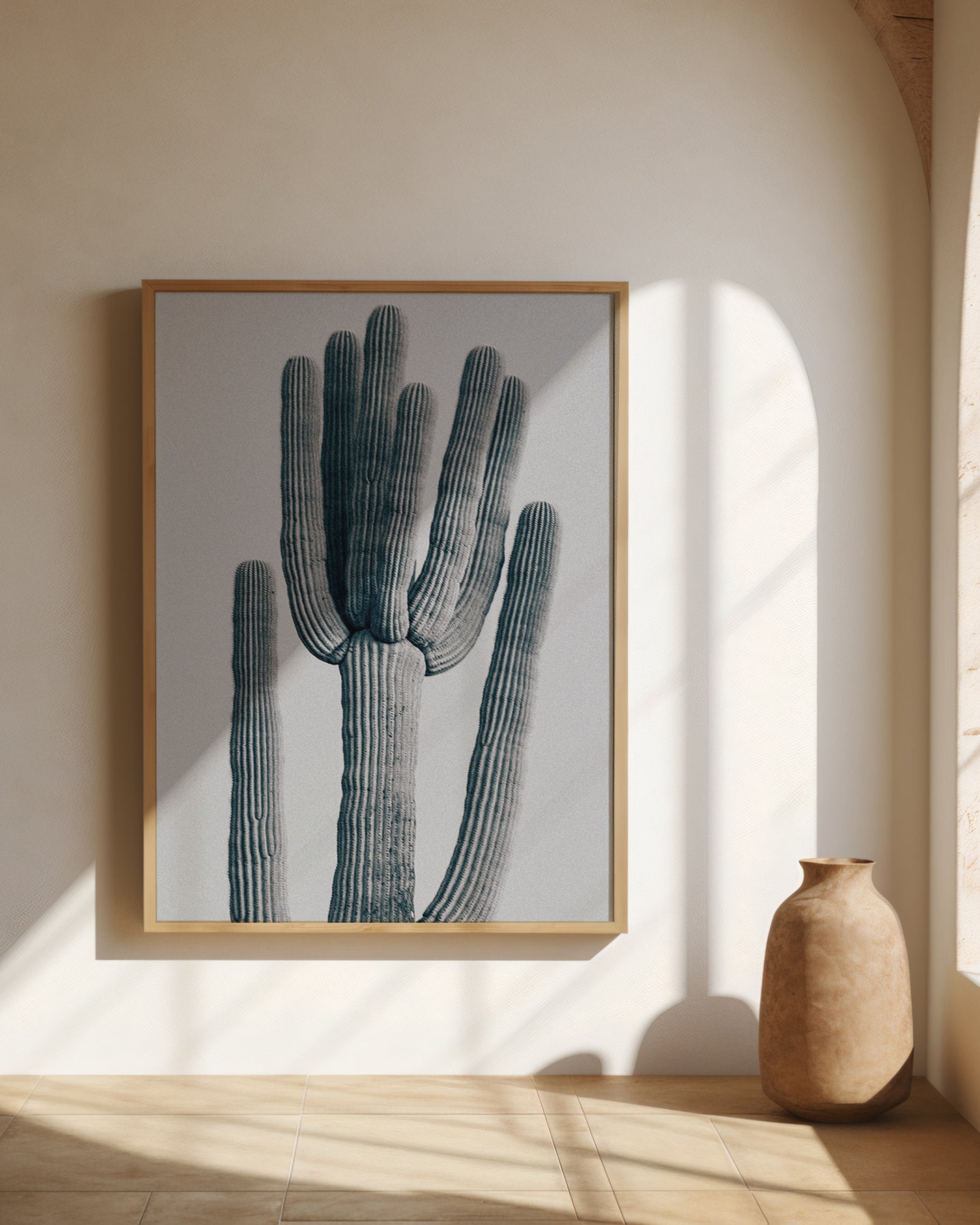 A neutral, grainy desert scene in Arizona. The Saguaro is the giant, cactus found growing across the rugged terrain of Arizona's desert. A beautiful, minimal art print to brighten your walls. Photography by Erika Carlock.