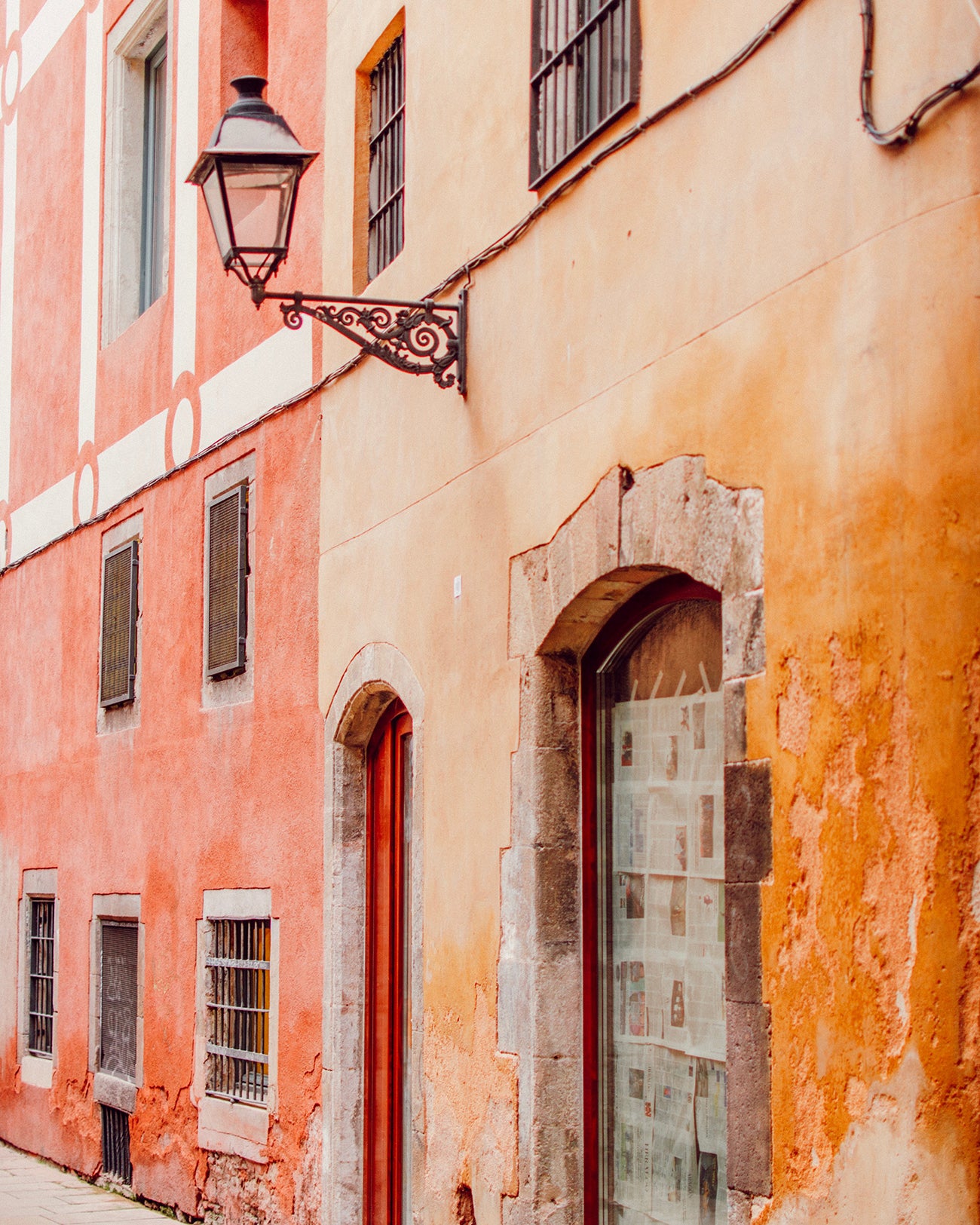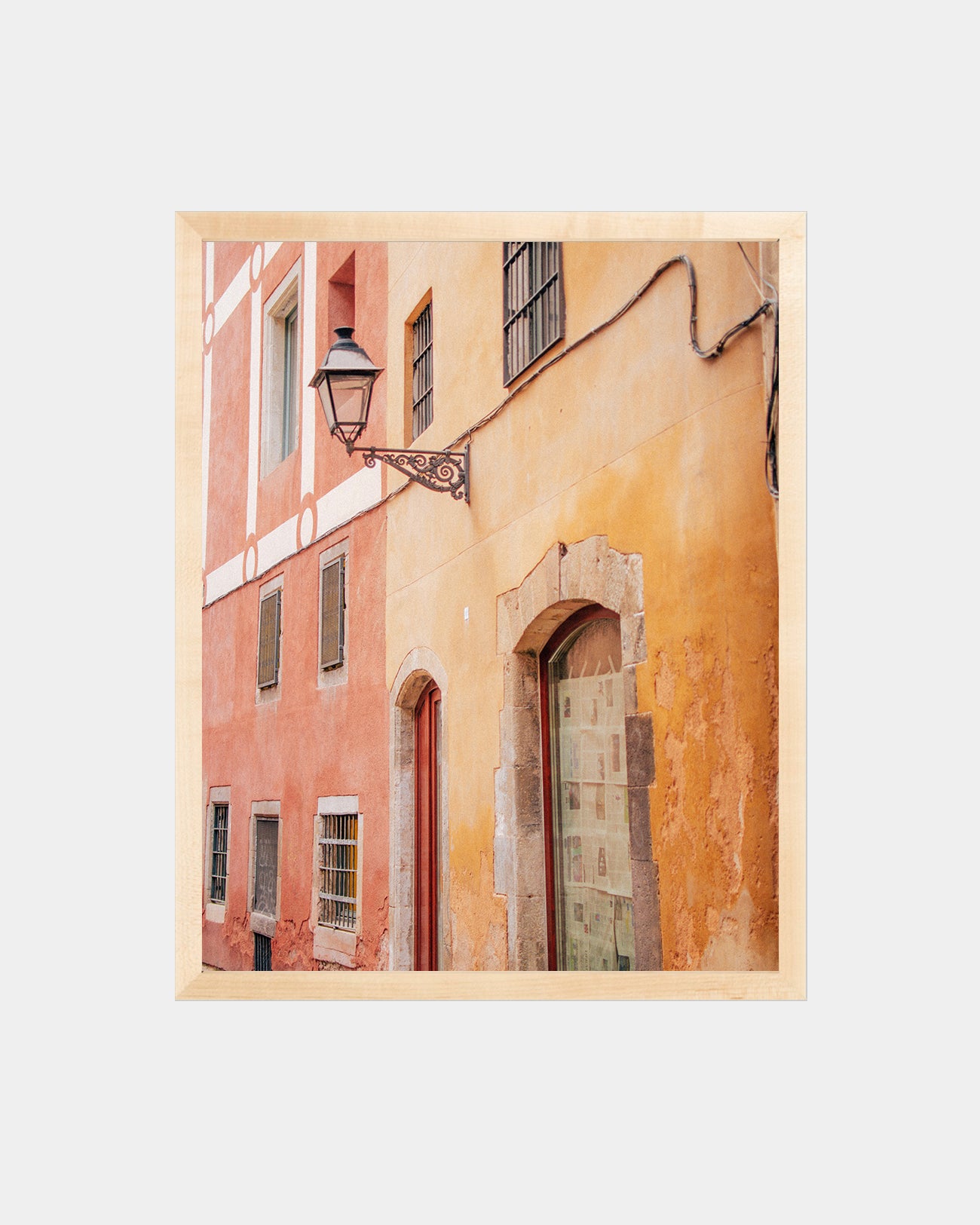 A colorful Spanish street in Barcelona by Erika Carlock. A beautiful, minimal art print to brighten your walls.