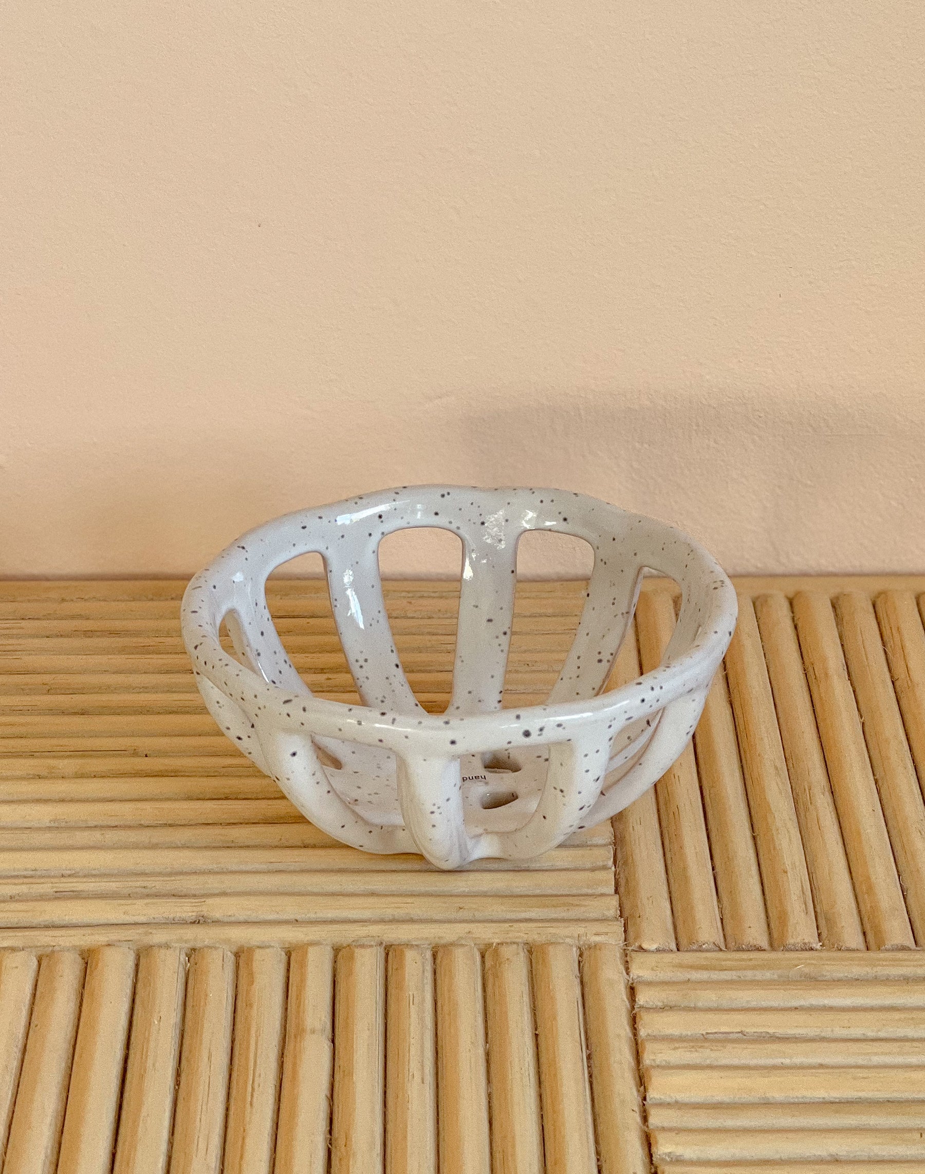 Abstract details. Crafted of stoneware with speckled details, this unique bowl adds a striking abstract accent in any space. Place it on a coffee table or in the kitchen as a fruit bowl, or use it at the entryway to store on-the-go essentials.