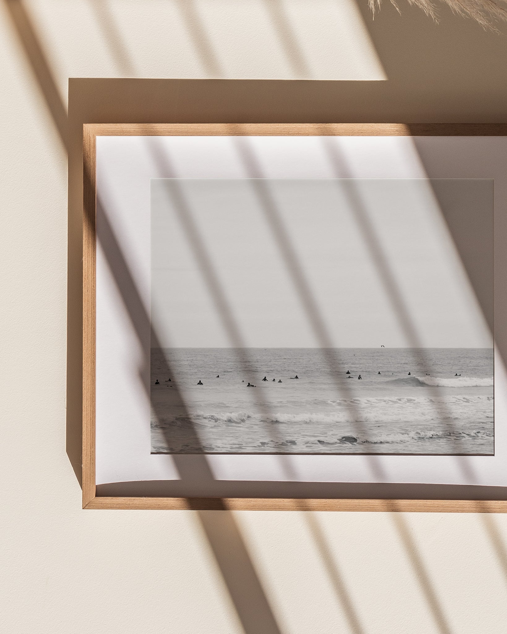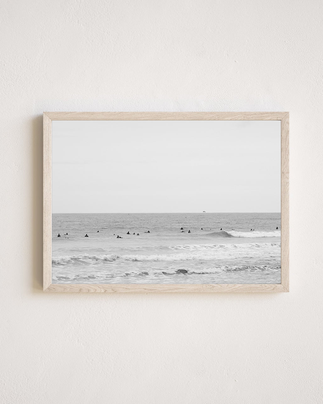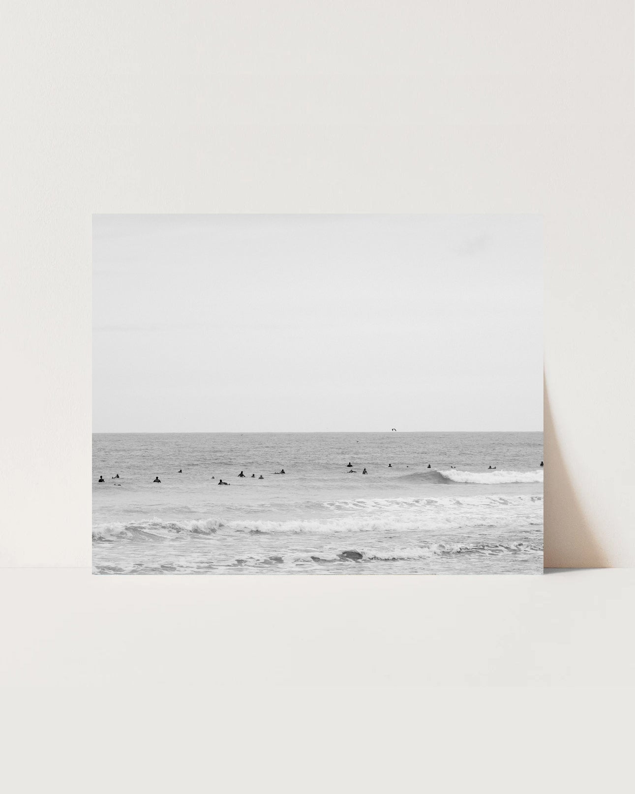 A beach scene of surfers in Malibu by Erika Carlock. A beautiful, minimal art print to brighten your walls.